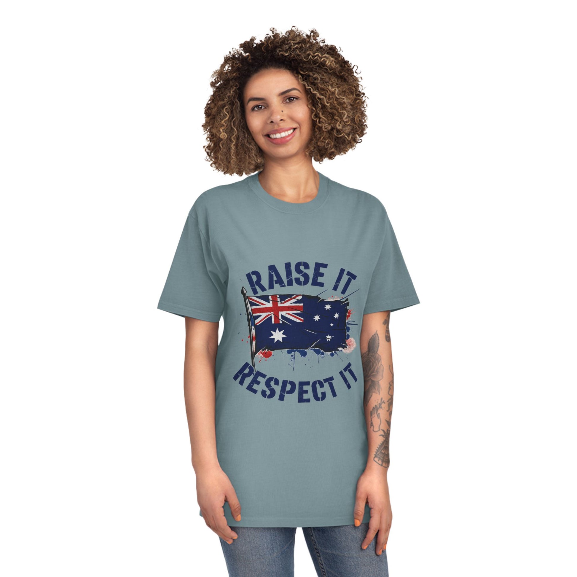 - Bold “Raise It, Respect It” slogan + Aussie flag graphic — strong message, crisp print, built to last
